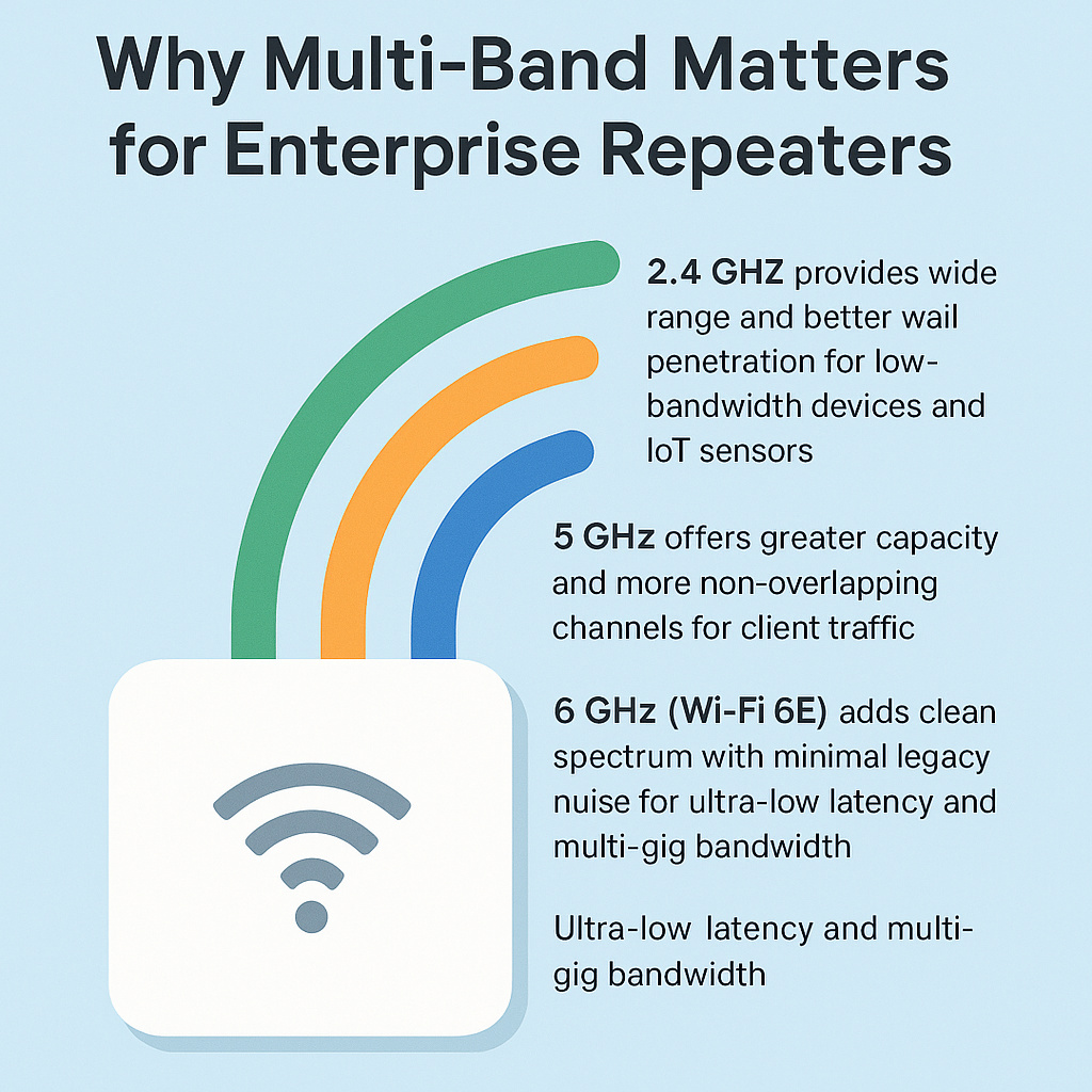 When a repeater can operate on multiple bands simultaneously, it can balance client access, dedicate one band to backhaul, and avoid the severe throughput penalties that plague single-radio extenders.