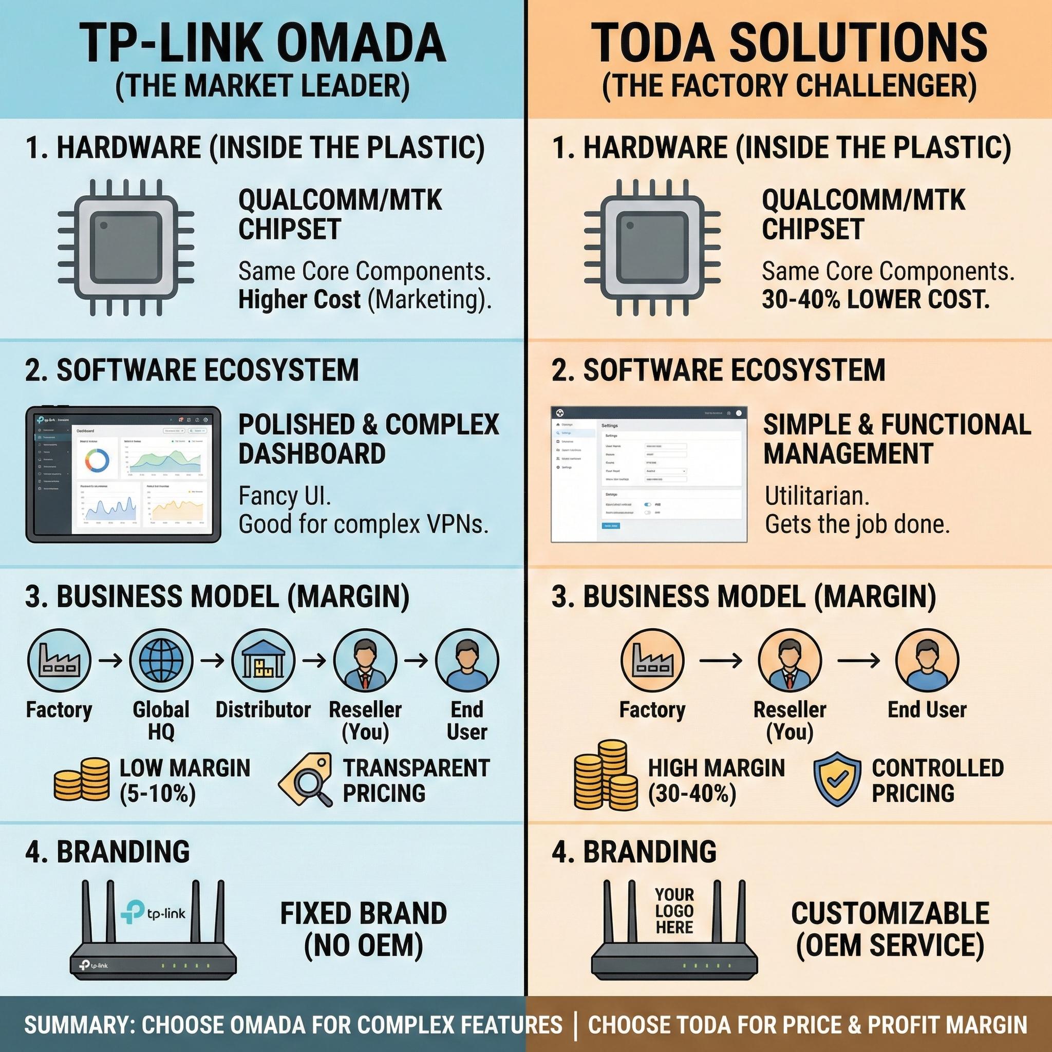 At Toda, we respect TP-Link’s engineering. But we believe there are better ways for B2B partners to monetize. Below is a ruthless comparison between the Market Leader and the Challenger.