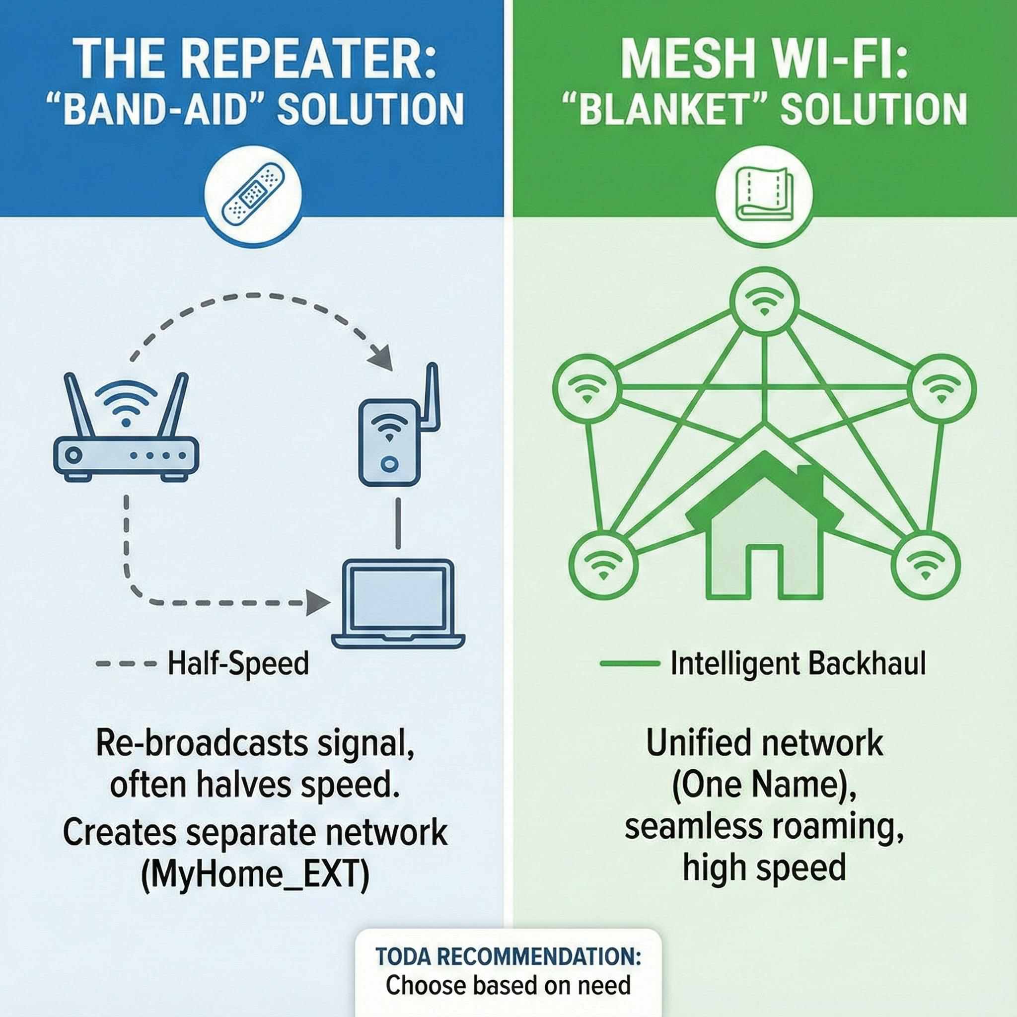 Repeaters are not obsolete; they still hold a place in the entry-level market. But for modern households with 20+ connected devices, Mesh networking is the only way to ensure user satisfaction.